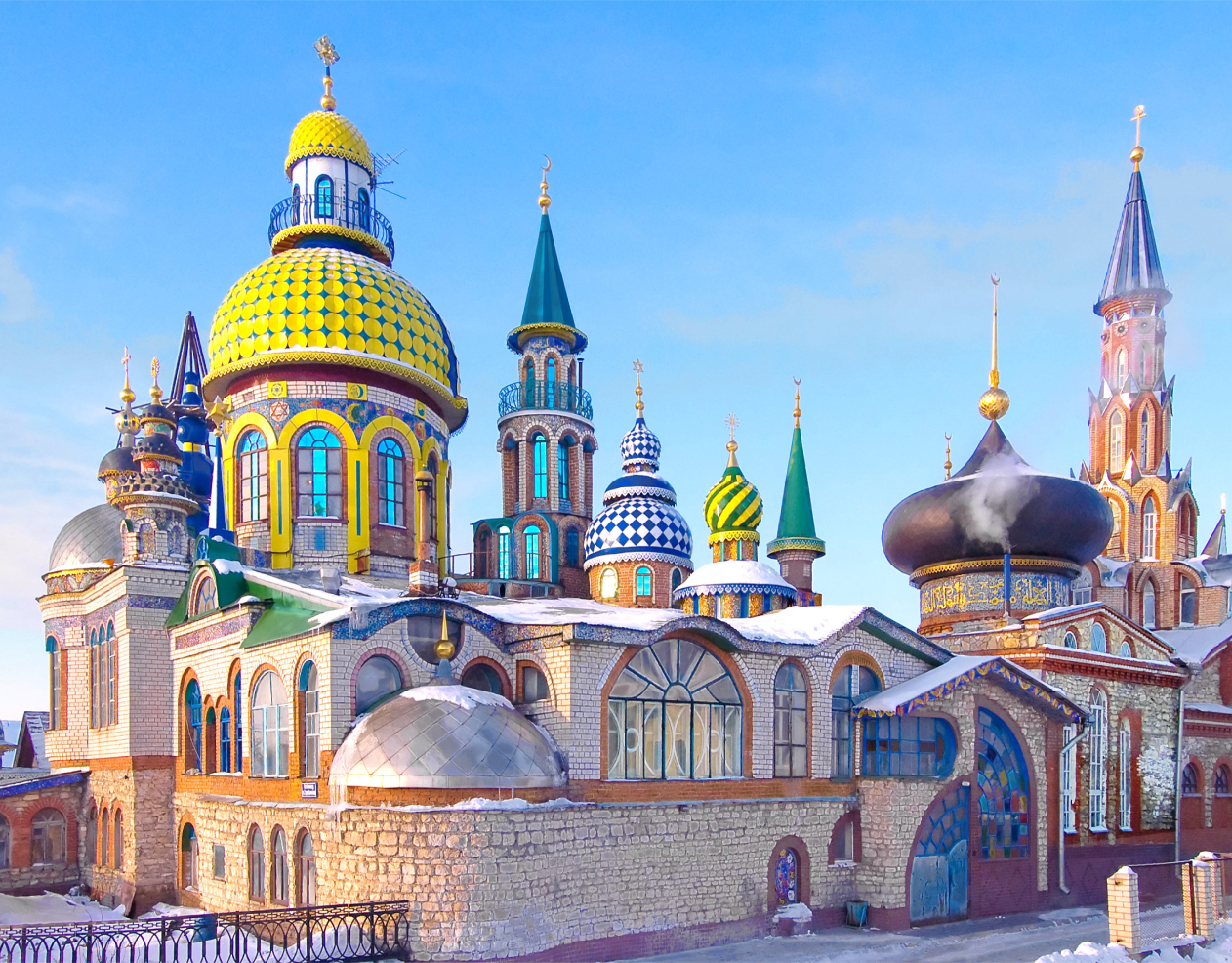 По возвращении, на вашем пути в нескольких километрах от Казани, вас встретит уникальное строение необыкновенной красоты. Храм всех религий — это каскад зданий, совмещающий в себе гармоничное сочетание строений самых разных культур. Здесь мирно соседствуют православная и католическая церкви, мусульманская мечеть, иудейская синагога и буддистский храм. Храм, на самом деле, является символом архитектуры и музеем. Сейчас в комплексе несколько абсолютно разных залов: Египетский, Католический, Чайная комната, зал Иисуса Христа, театральный зал, Картинная галерея. Говорят, что у этого места необычная энергетика, которую стоит ощутить.